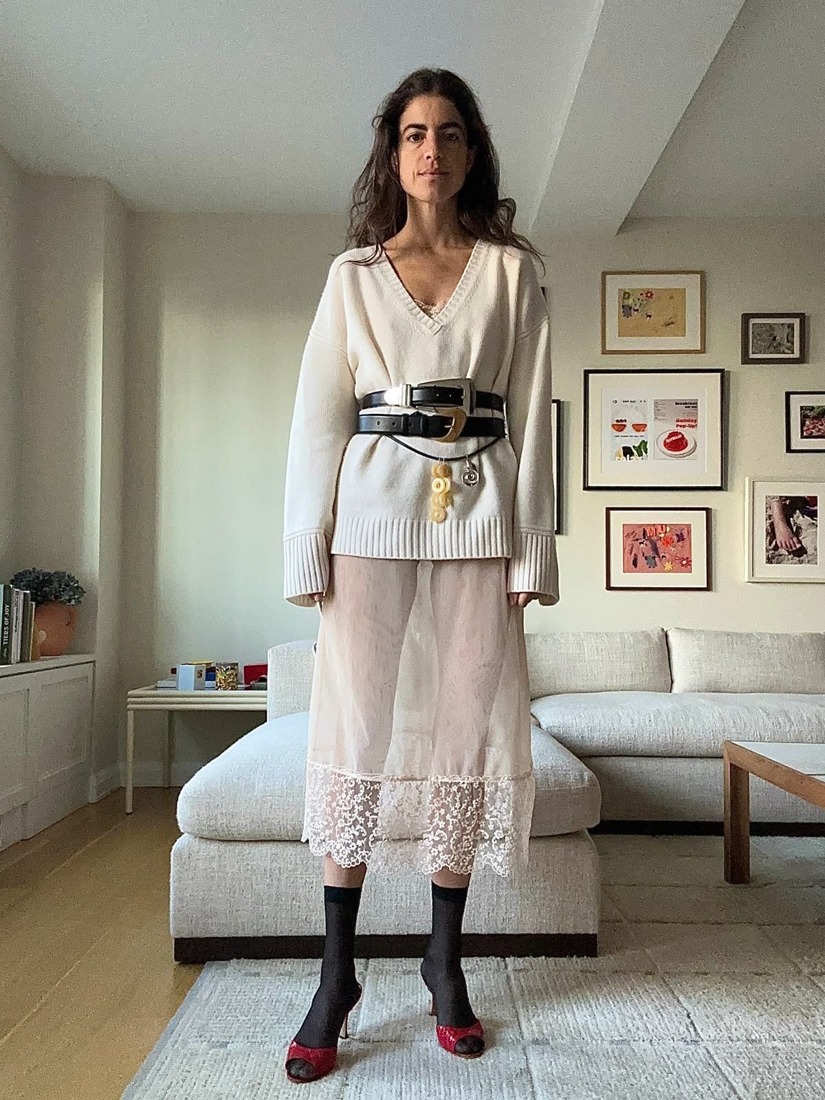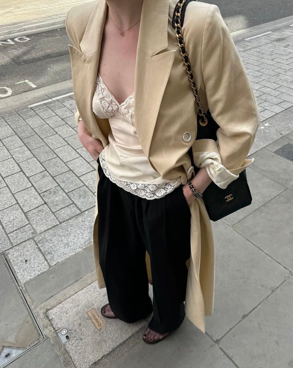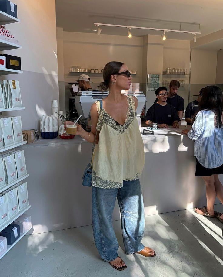 Lace has always had its place in fashion, especially in a la dolce vita, Dolce & Gabbana, Monica Belluci-for-Blumarine context. V hot, in a lingerie-as-outerwear, male gaze-y sort of way. But the contemporary take is more akin to Phoebe Philo for Celine circa 2015/2016, when she introduced lace trims to slip dresses and skirts. It’s more about a romantic flourish, and the juxtaposition of the delicate with the robust — think: lace-trimmed tunic layered over baggy cargo pants or slouchy jeans.