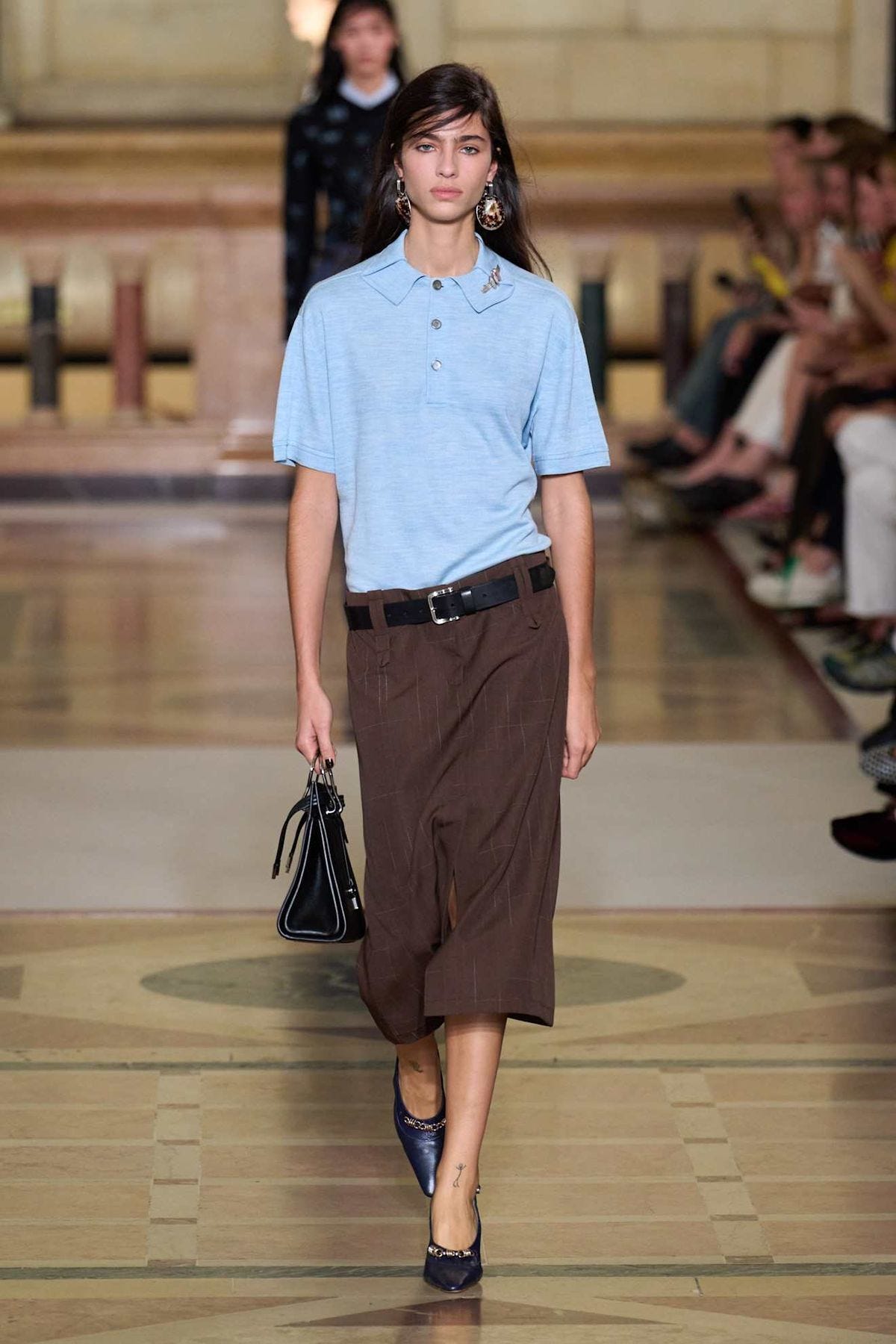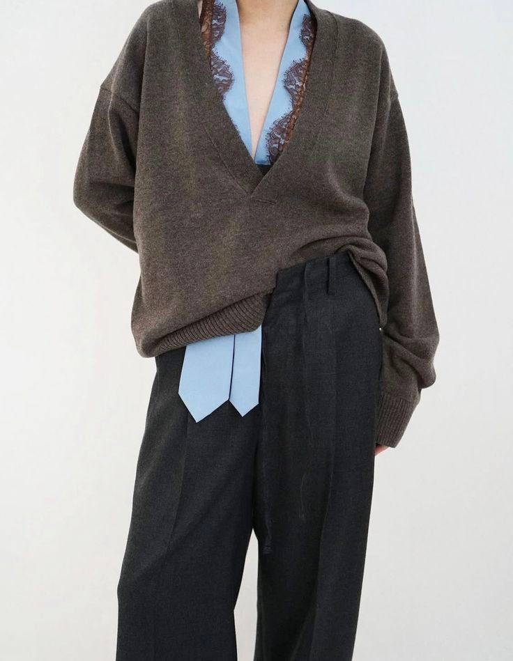 Stick to fine knits (leave the chunky knits for weekend slouch). The Miu Miu / Tory Burch-ified collared polo effect continues to dominate here — think: pointed collars and delicate buttons in sorbet and primary colours, worn with slouchy trousers for a combo of prep and cool. Give oversized knits office legitimacy by pairing them with tailoring and lace-trimmed layers.