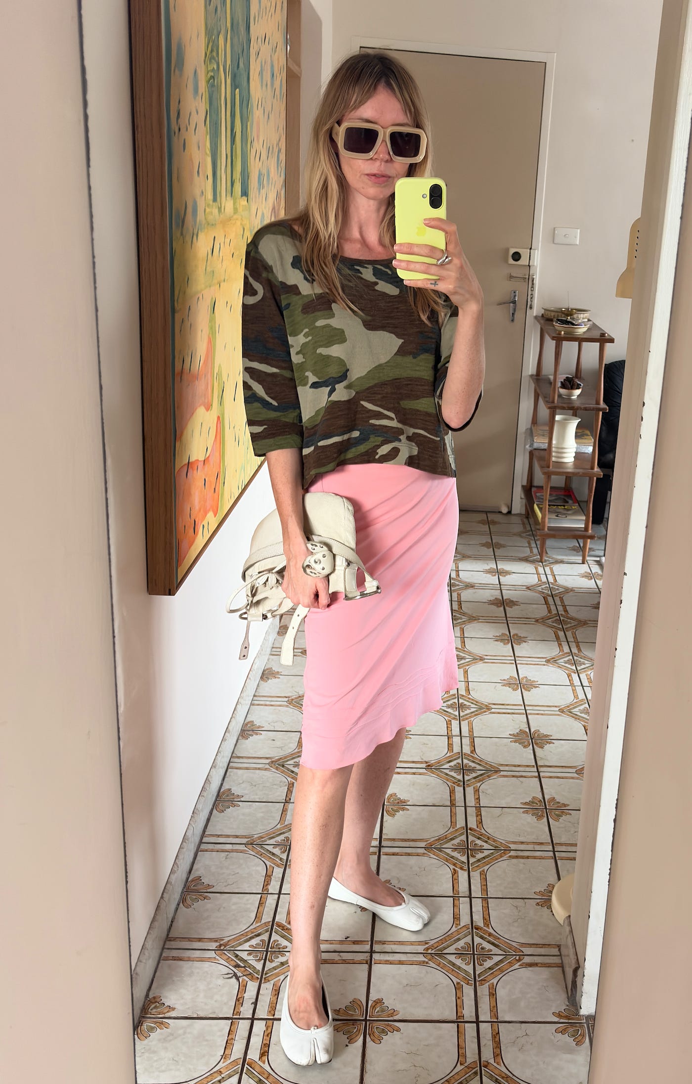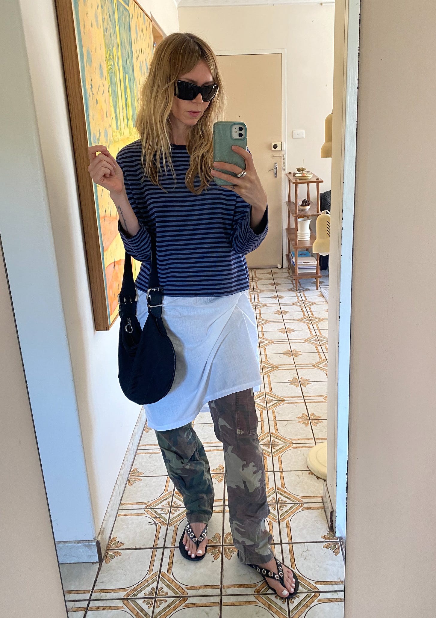 I'm working in my support work role today, so I'm dressed for comfort but also keeping things versatile with layers as we're heading into the CBD and, well, Melbourne weather. I found these camo pants and this antique chemise slip at a flea market in Turin, and wearing them always takes me back to that trip. These are the kinds of pieces I gravitate towards when I have time to be more considered—pieces that carry memories and meaning.