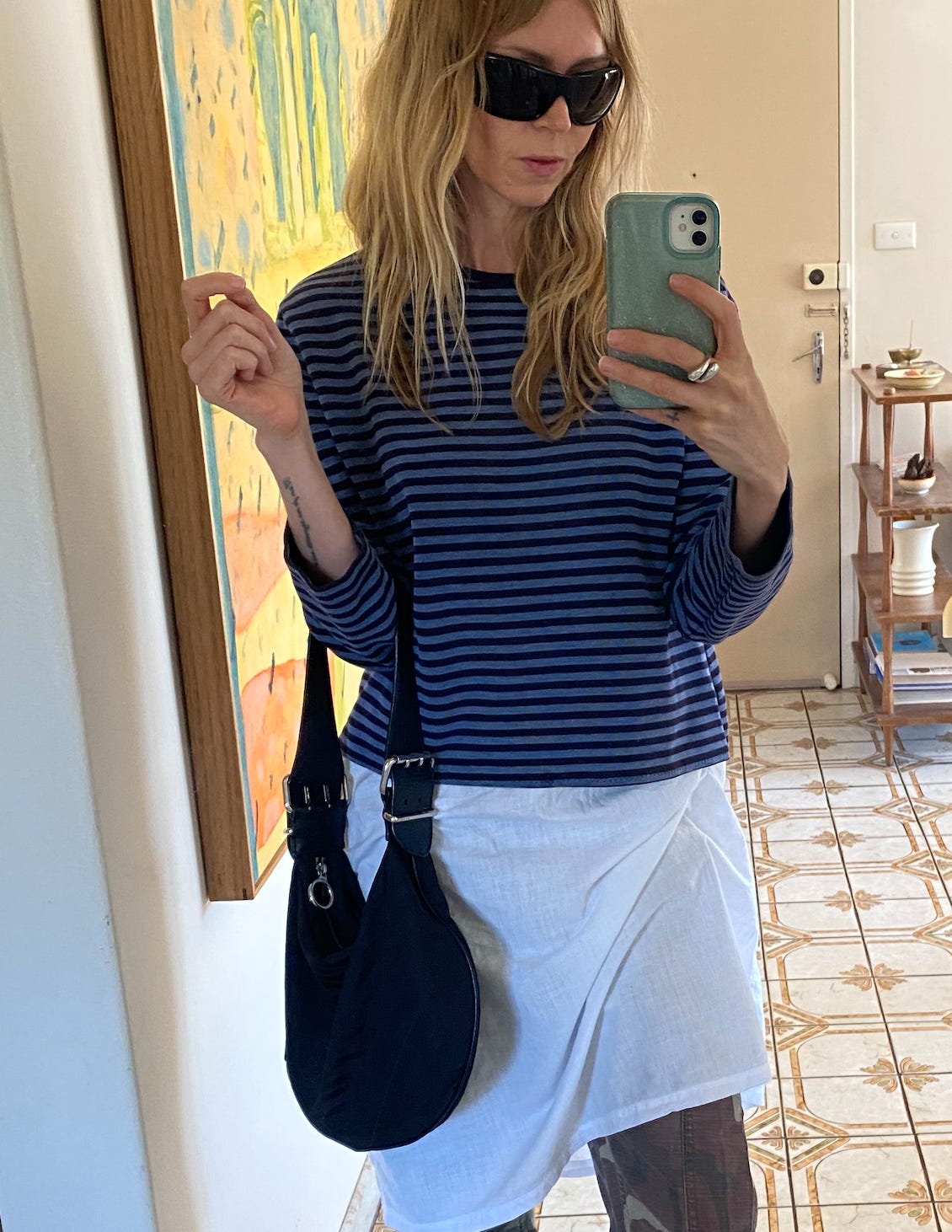 I have the day off work today and I finally get to join my partner and daughter who are on holidays. My hair's a little sweaty from yoga, and we're rushing to squeeze in a pram nap, so I'm keeping it relaxed. There's something playful about the contrasting patterns and fabrics, and these obnoxious sunnies from Loewe cover everything and tie it all together. Even when I'm rushing, there's room for a little experimentation.