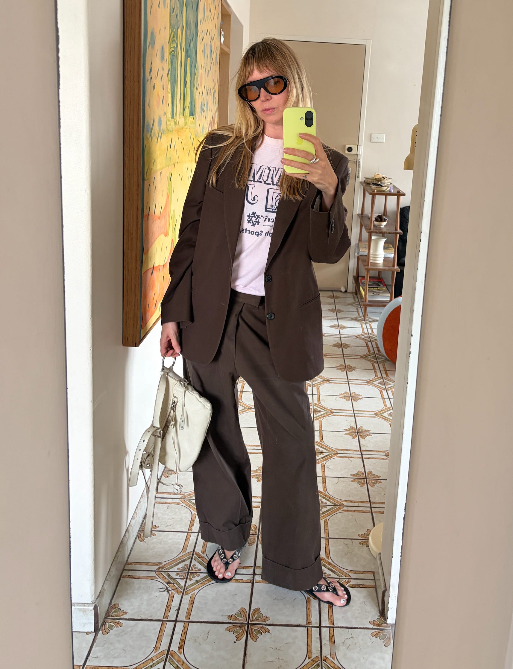 I'm meeting a friend for a wine (which will likely turn into many). I've borrowed my partner's Dries suit, clipping the fastener onto the belt loop to make it fit. I've toned it down with a vintage tee and flip flops from Sydney label Maria Farro, which keep the look grounded so it doesn't feel too formal.